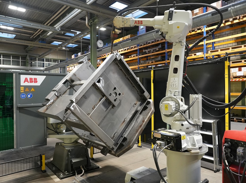 Primär diesen massiven Stahlblech-Ständer schweisst der ABB-Roboter derzeit.