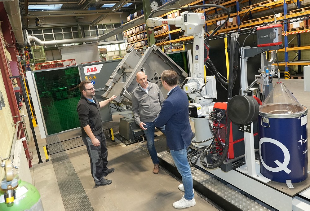 Michael Mahler, Herbert Wicki und Olivier Keck (v.l.n.r.) bei der neuen Roboterzelle in Hasle .